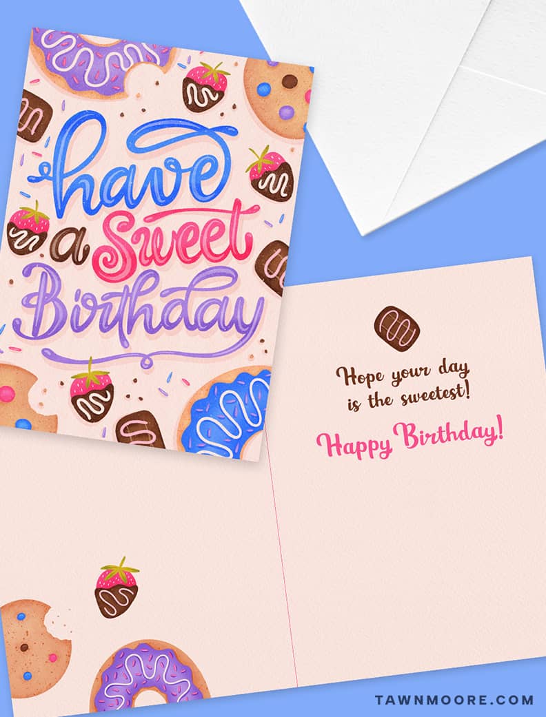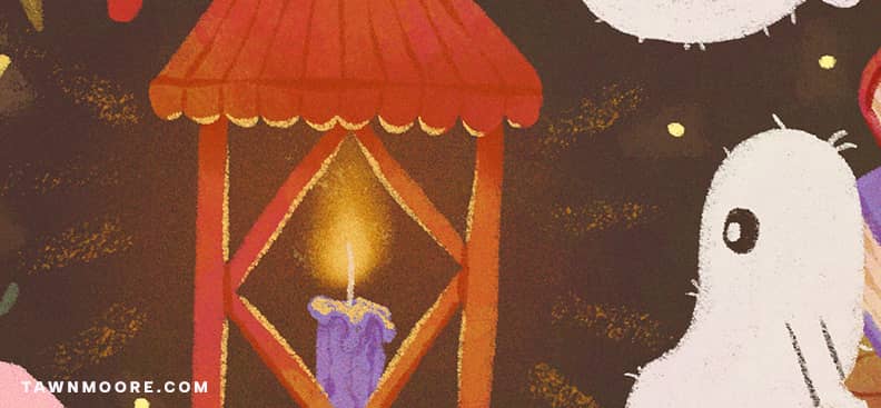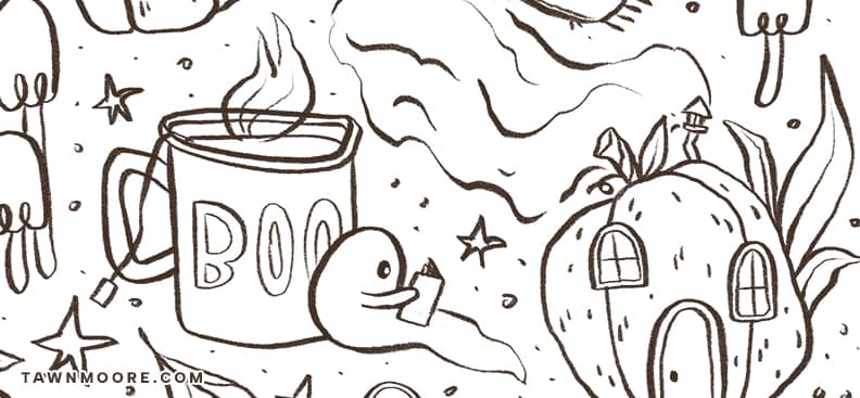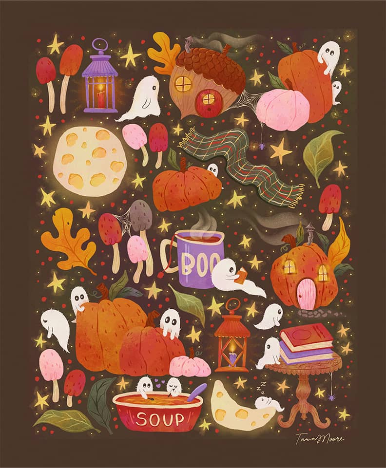 This month’s finished pieces include a playful lineup of colourful studio staples, the full illustration behind this month’s wallpaper, so you can see all the cozy fall details and friendly little ghosts that don’t fit in the cropped wallpaper version, and a bright new colour refresh for my Sweet Birthday Card.