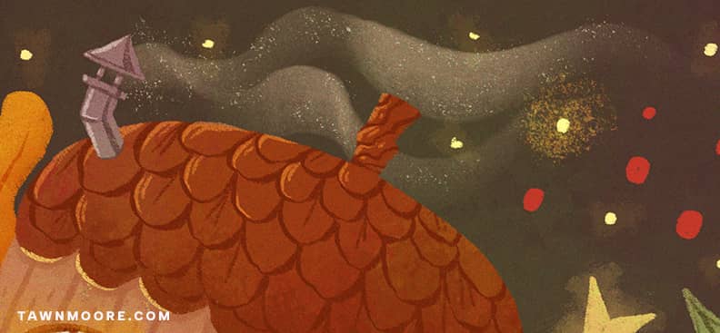This brush added the sparkle in the smoke and the warm light spilling from the windows. Layered gently, it gives that chalky, glowing texture that feels like tiny bits of magic caught in the air.
