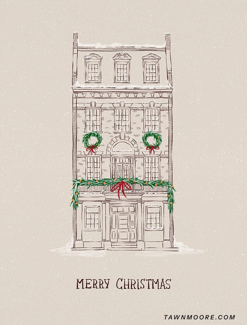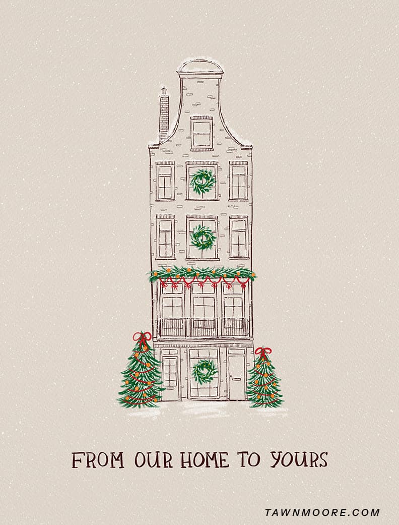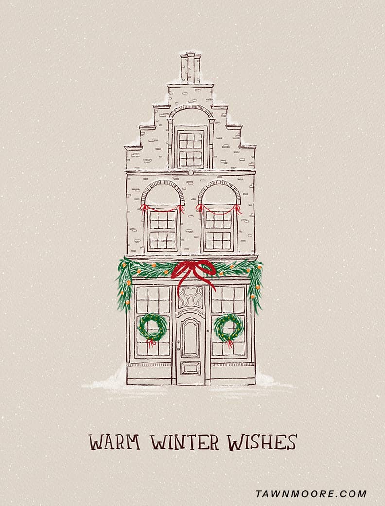 This mini set was created for my Art Hustle Insider brief. It’s a tiny lineup of European-style homes with warm holiday touches, sketched loosely and kept minimal so the ribbons and wreaths pop. They feel like little postcards from a merry winter walk.