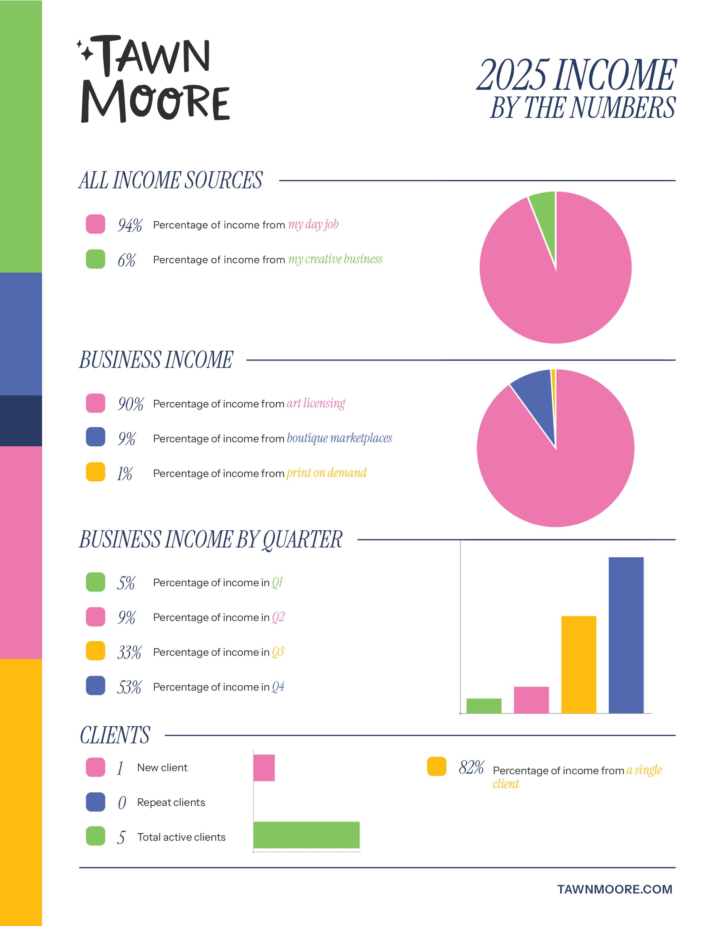 By the numbers, my creative business still makes up a small slice of my overall income, about 6%, with my day job covering the rest. But within that, something important happened. I doubled my licensing income again this year. It’s not much in the grand scheme of things, but the fact that my art continues to earn anything at all still feels pretty incredible to me.